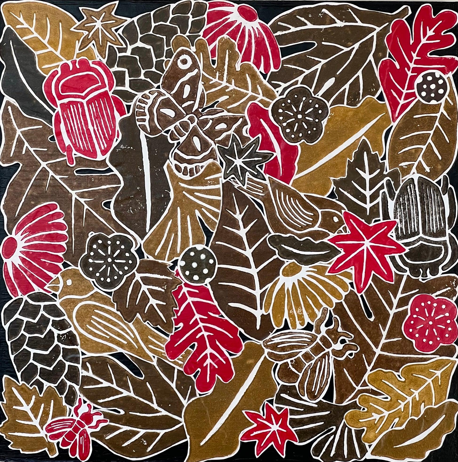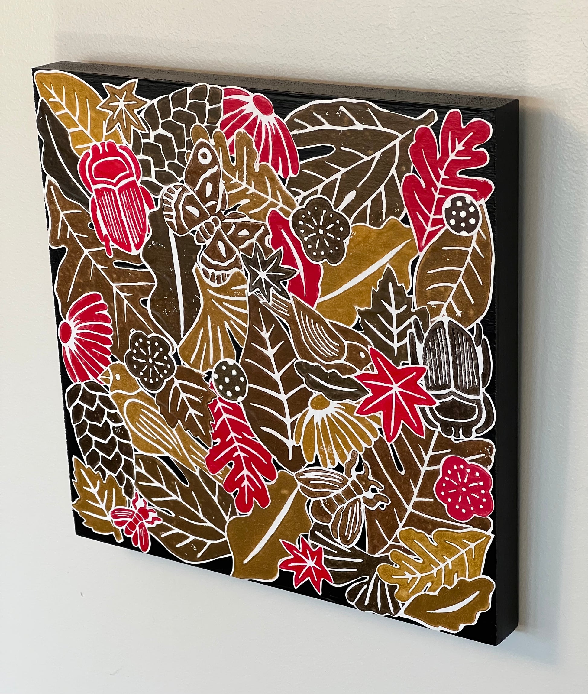 10" x 10" collage on solid board. Assembled from hand cut painted prints from my personally hand-carved blocks. Adhered and sealed with clear glaze. Board edges are 1" thick. Ready to hang.
