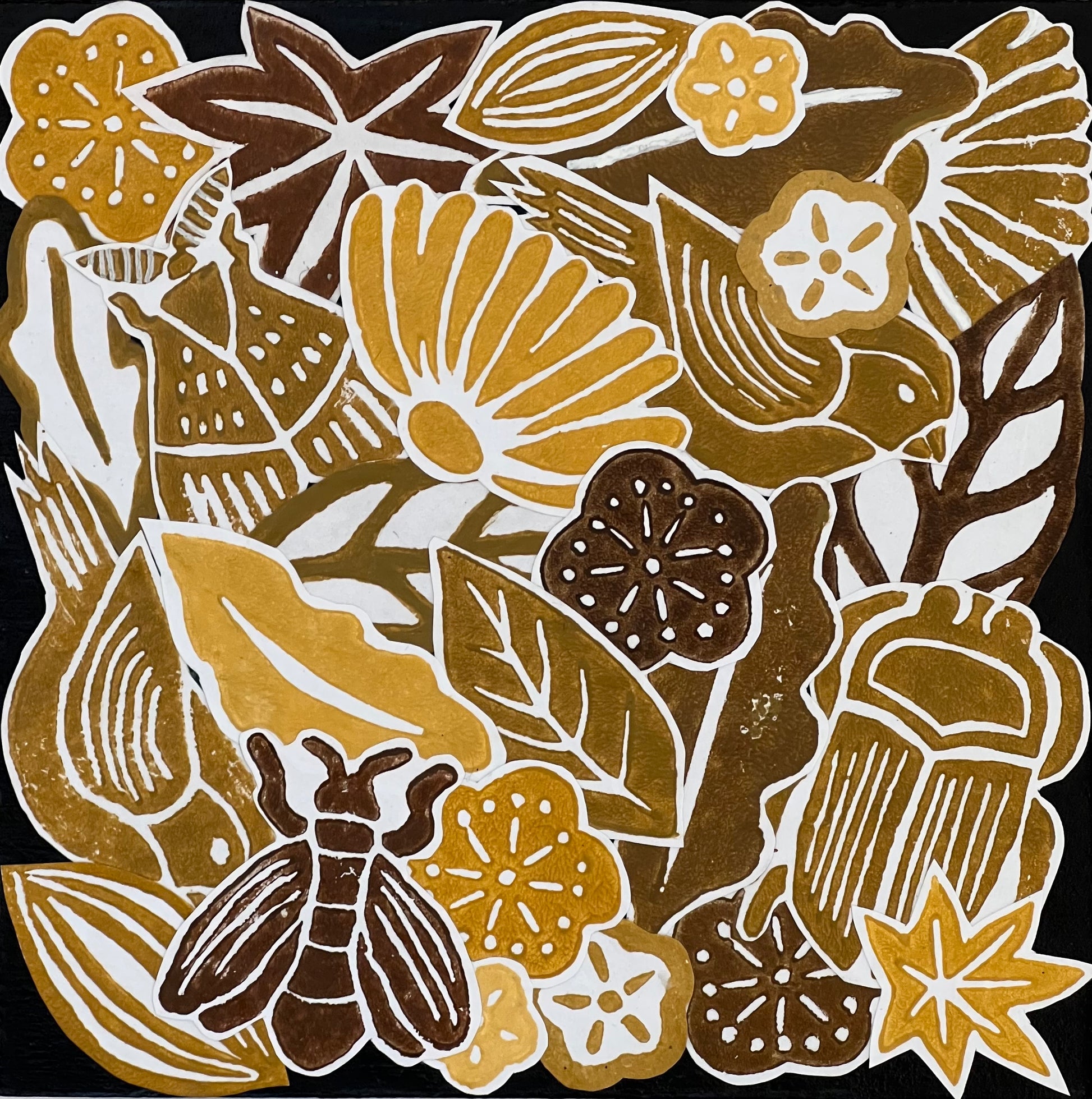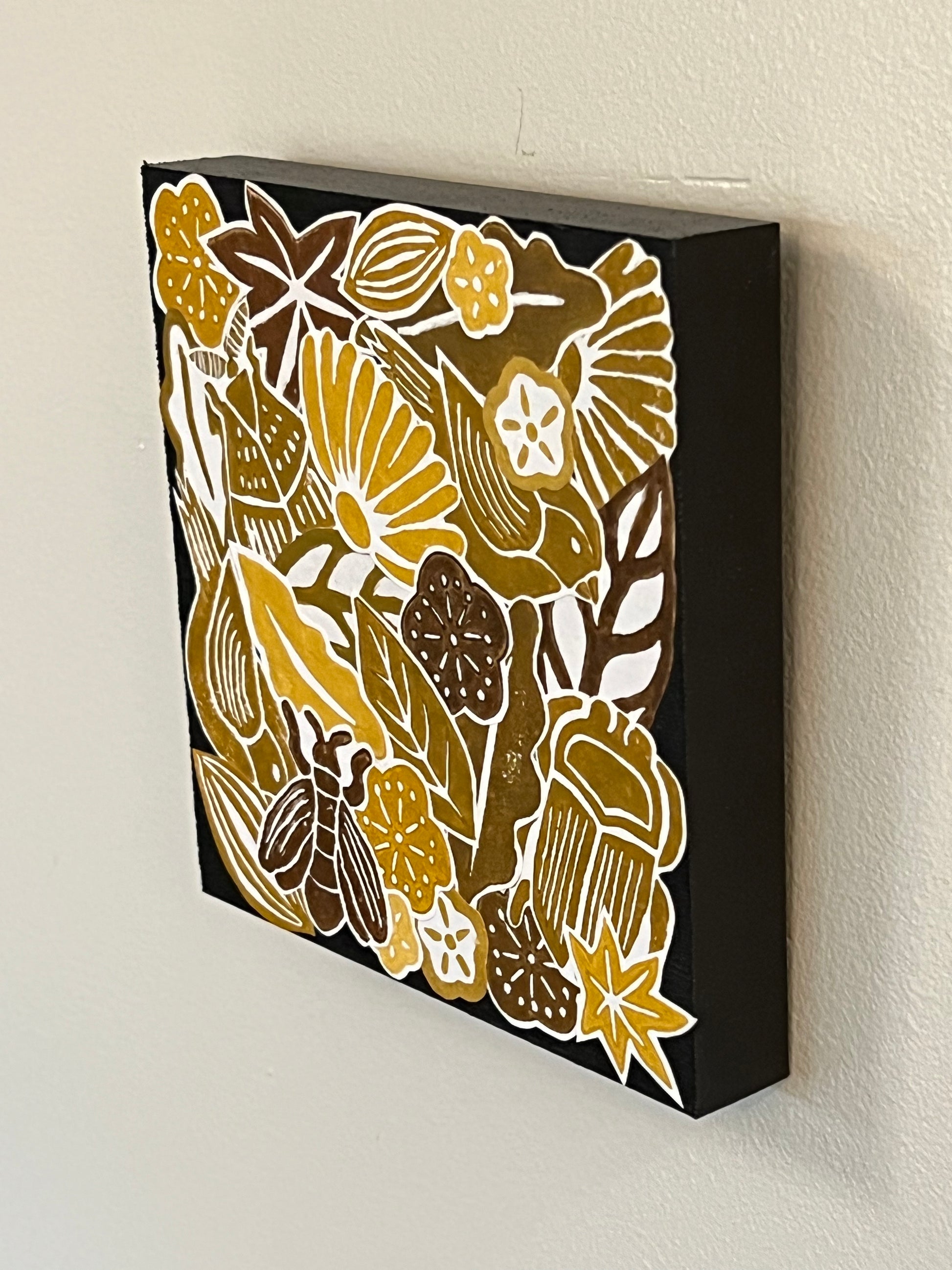 6" x 6" collage on solid board. Assembled from hand cut painted prints from my personally hand-carved blocks. Adhered and sealed with clear glaze. Board edges are 1" thick. Ready to hang.