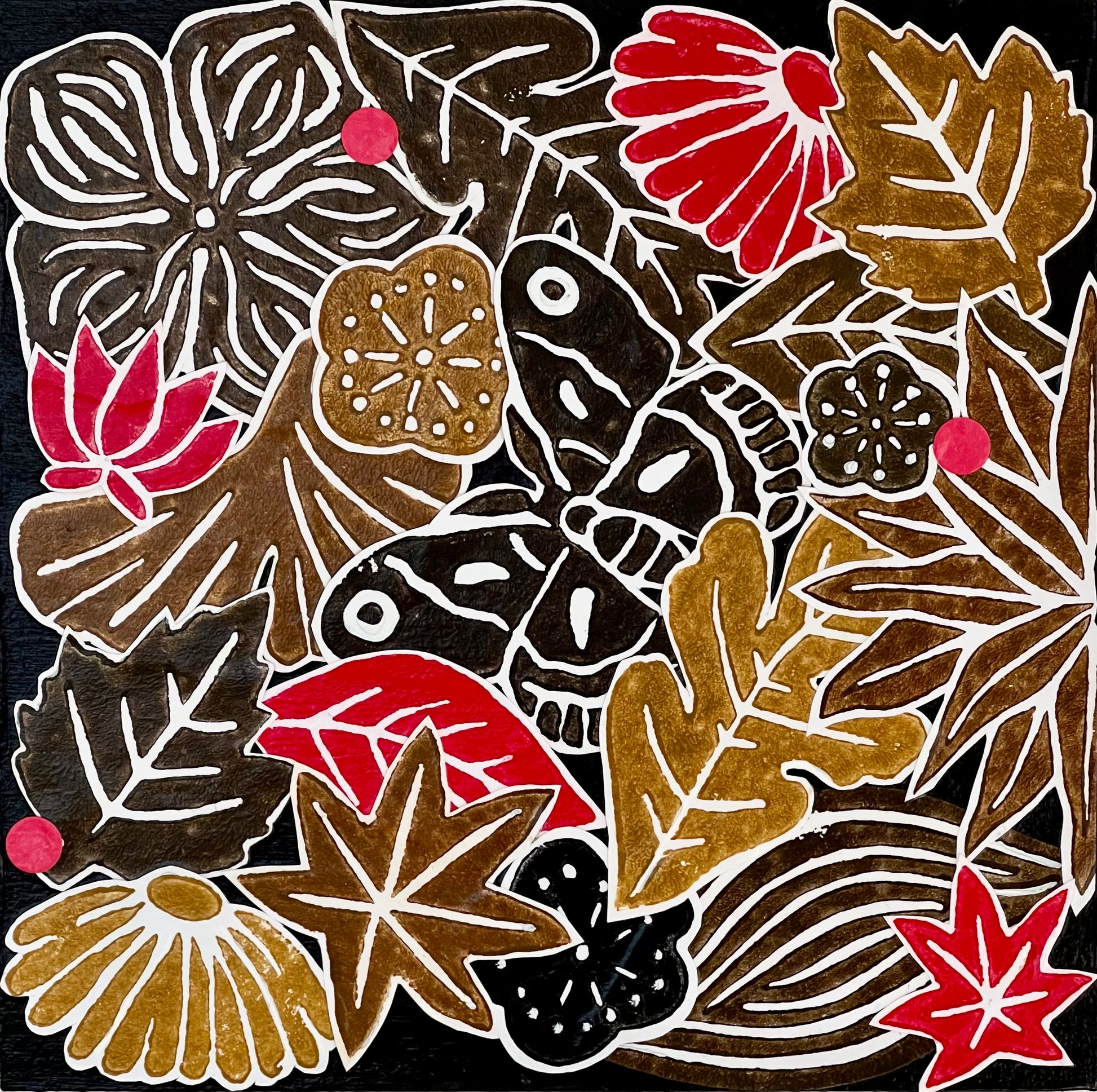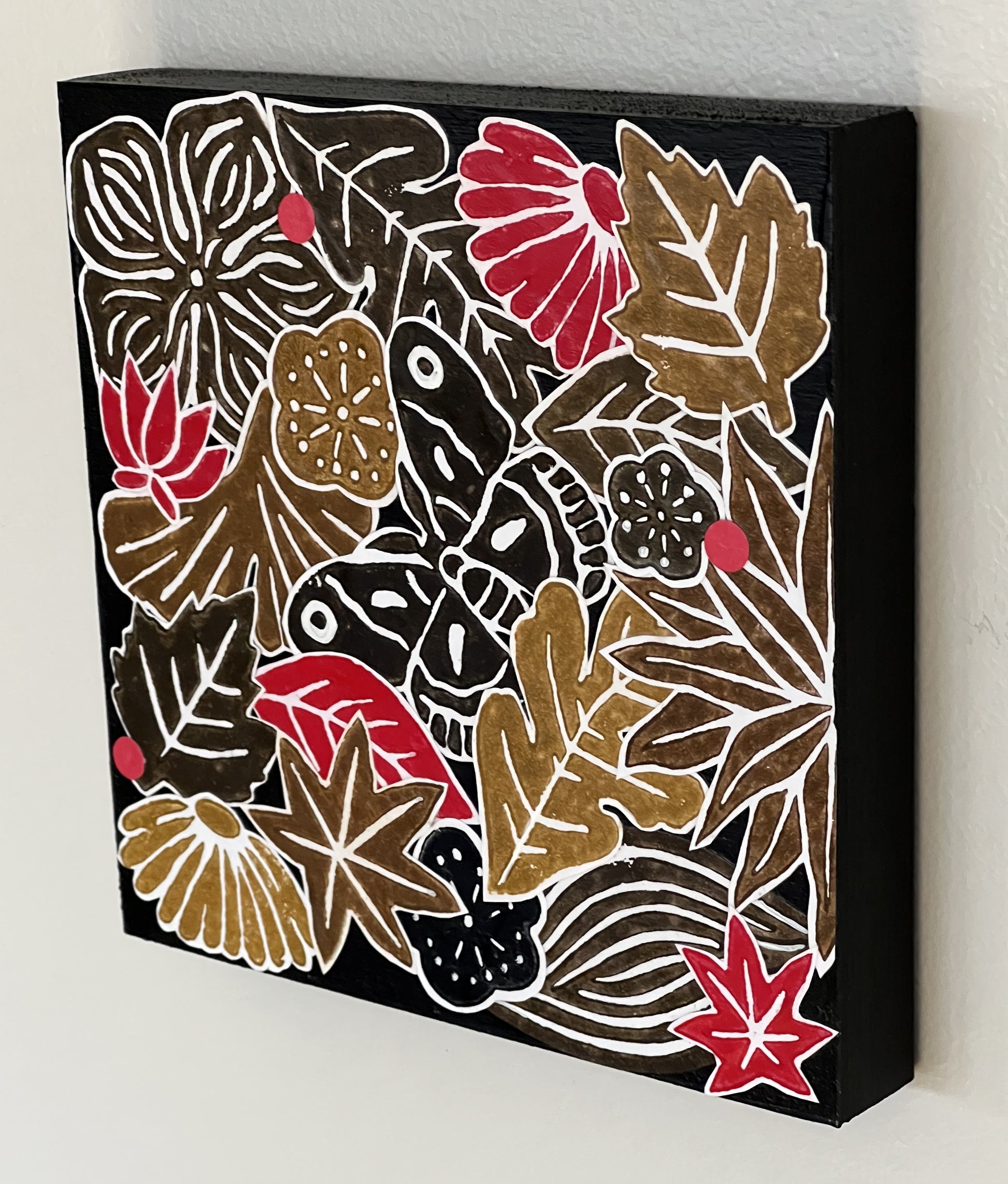 6" x 6" collage on solid board. Assembled from hand cut painted prints from my personally hand-carved blocks. Adhered and sealed with clear glaze. Board edges are 1" thick. Ready to hang.