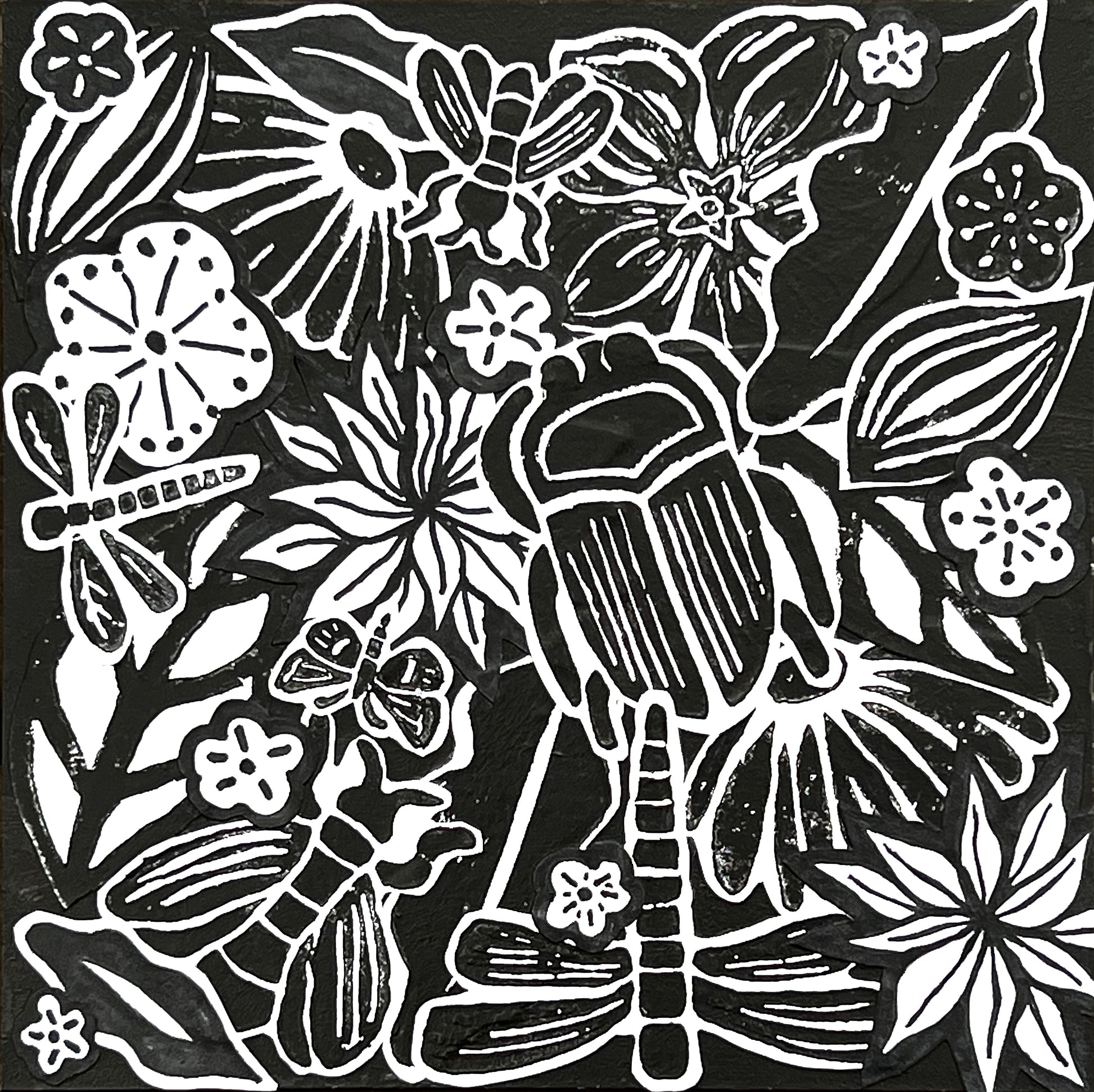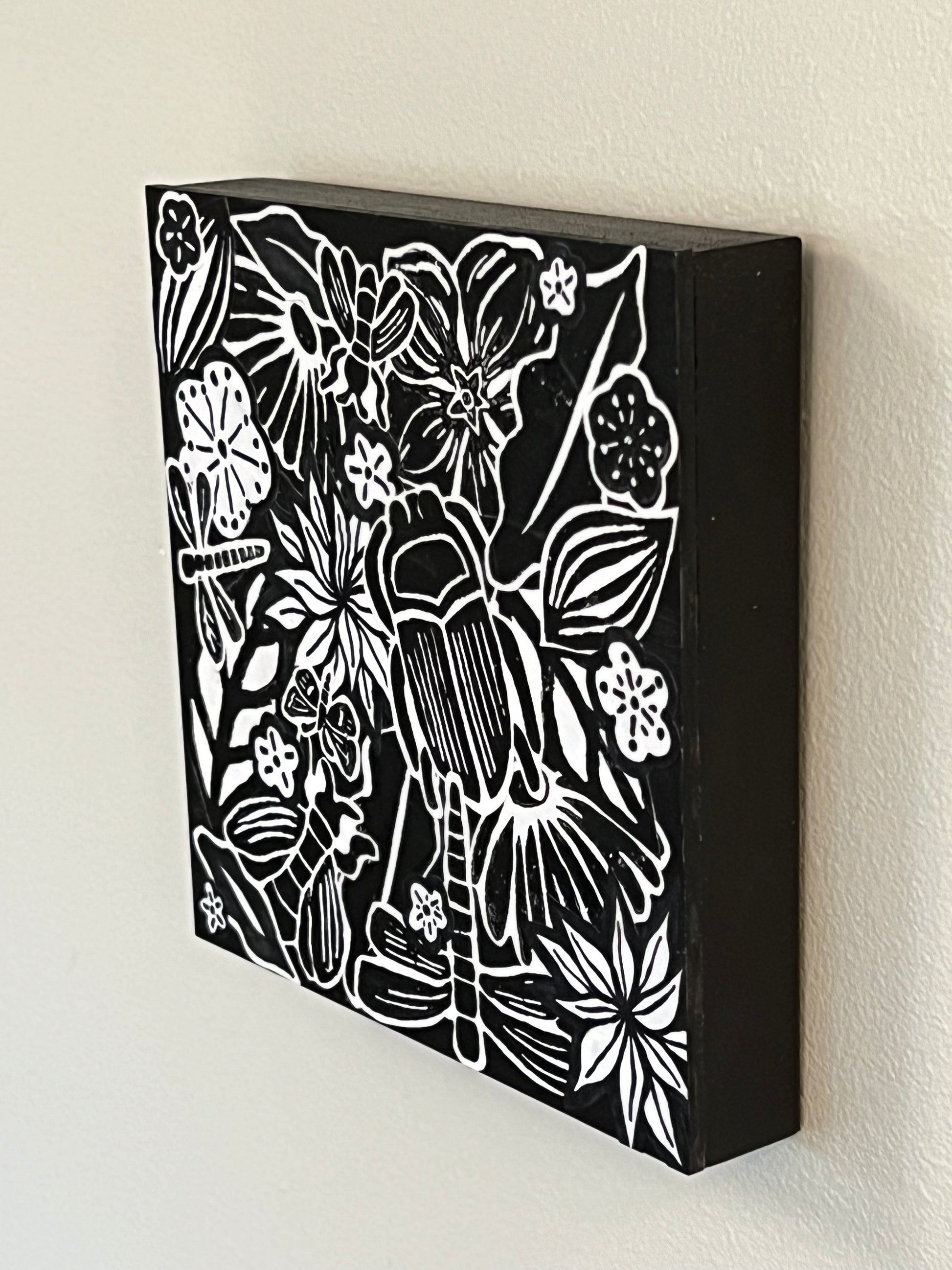 6" x 6" collage on solid board. Assembled from hand cut painted prints from my personally hand-carved blocks. Adhered and sealed with clear glaze. Board edges are 1" thick. Ready to hang.